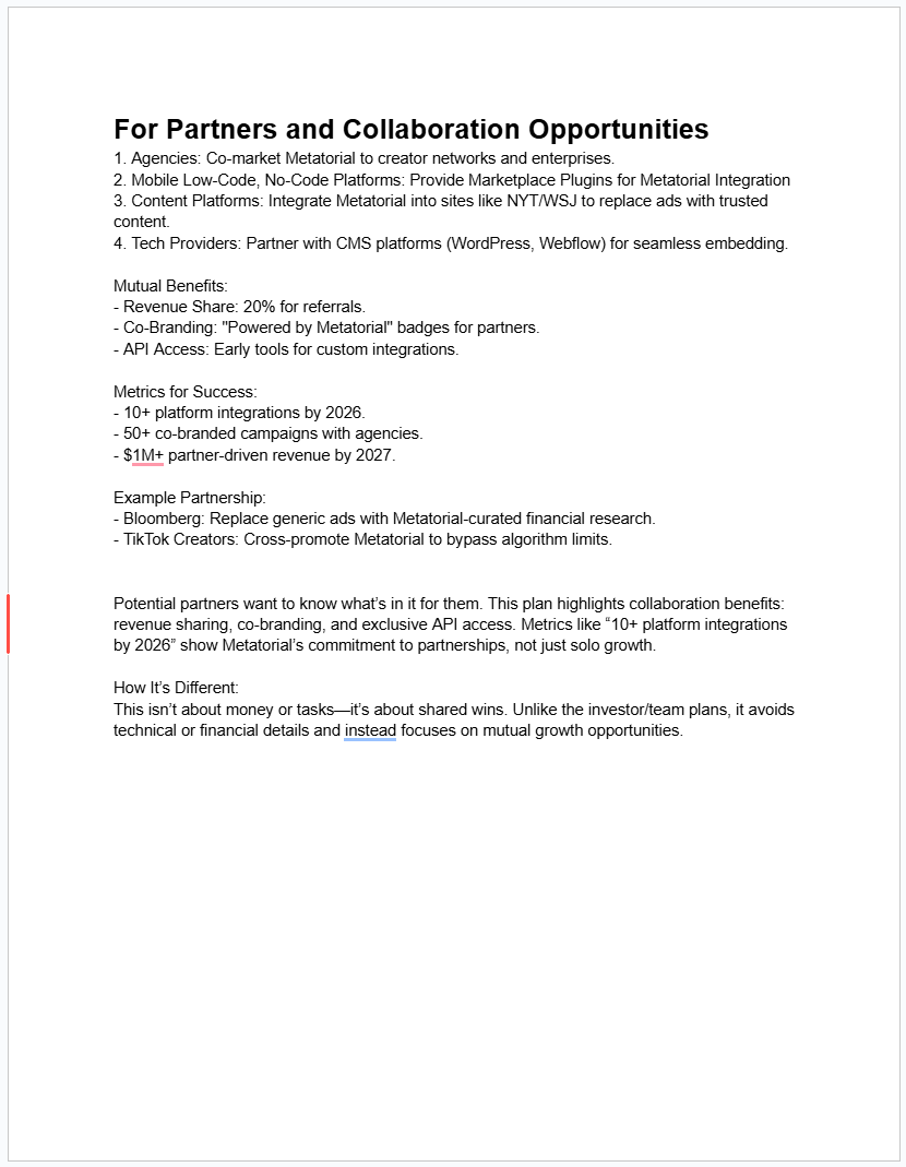 This last one’s different from the first two because it isn’t about money or tasks—it’s about shared wins. Unlike the investor or team plans, this one avoids technical or financial details and instead focuses on mutual growth opportunities.