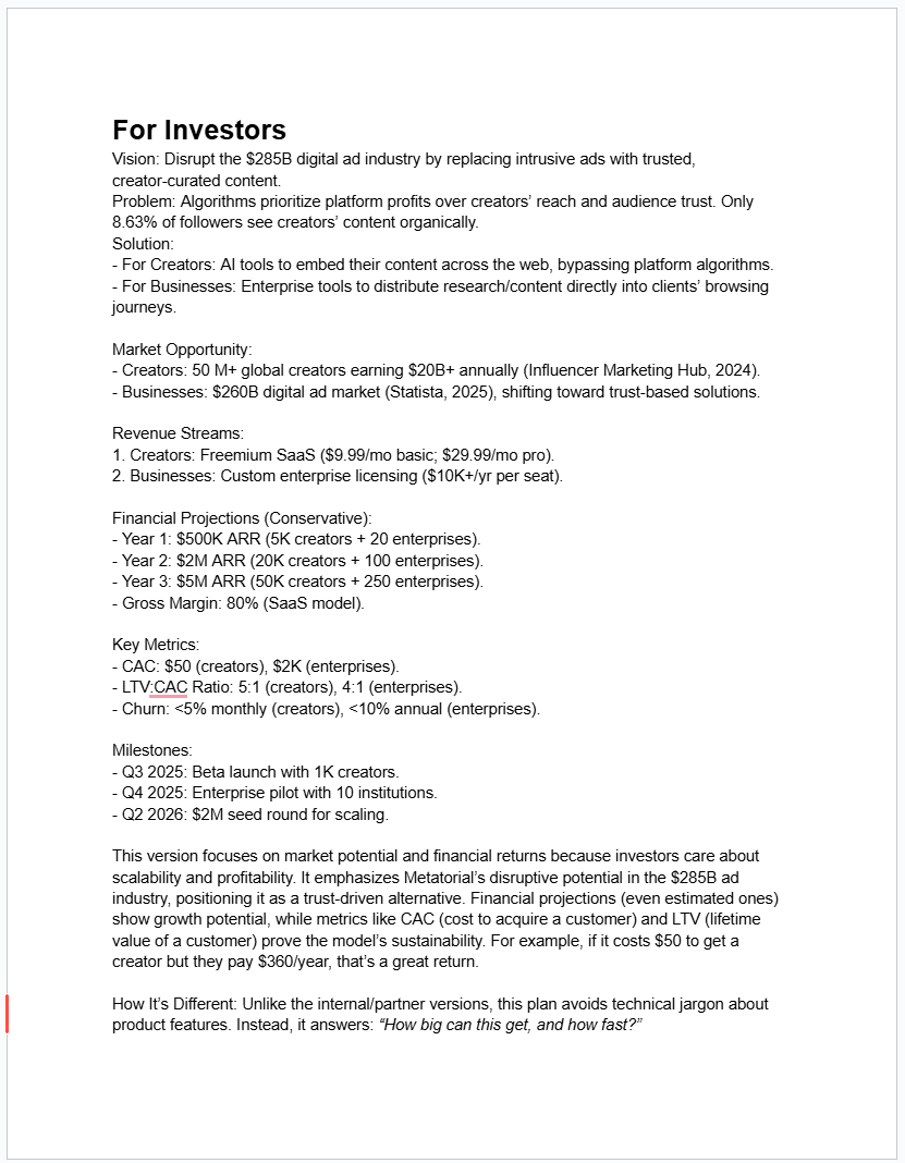 Of the three versions… This is the fancy one. It focuses on market potential and financial returns because investors care about scalability and profitability. It emphasizes my hustle’s disruptive potential in the $285B ad industry, and it positions it as a trust-driven alternative. Financial projections (even estimated ones) show growth potential, while metrics like CAC (cost to acquire a customer) and LTV (lifetime value of a customer) prove the hustle’s sustainability. For example, if it costs me $50 on advertising to get a creator but they pay $360/year, that’s a great return.
